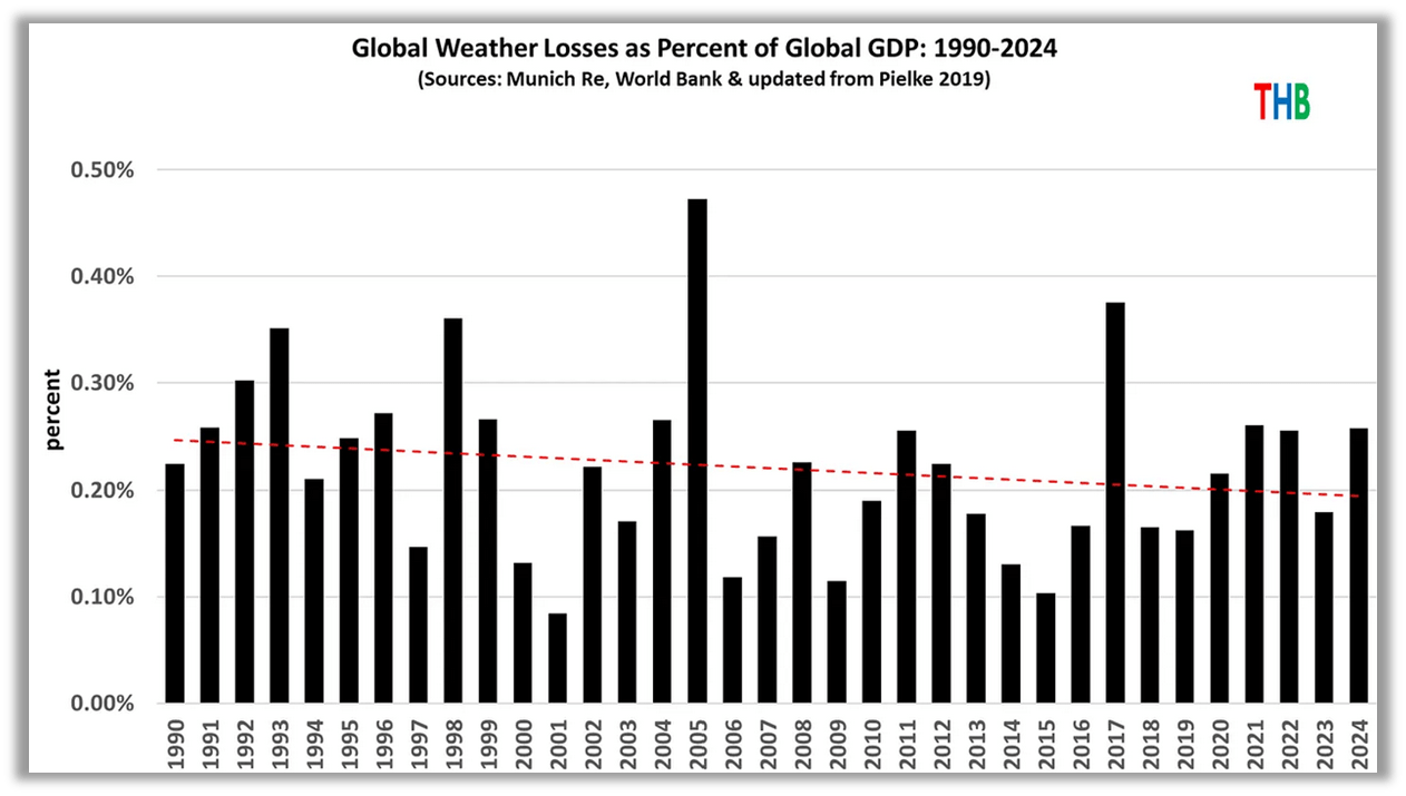 Figure 3: Global Weather Disaster Losses as % of GDP until 2024. Source: Prof Pielke [8]