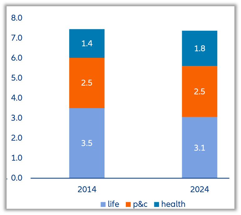 Figure 1: Gross written premiums (GWP) as % of GDP by segments | Note: p&c insurance = property and casualty, industrial insurance would be a part of this | Source: Allianz [1]