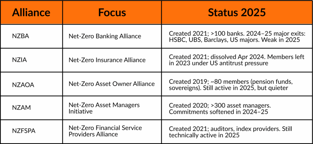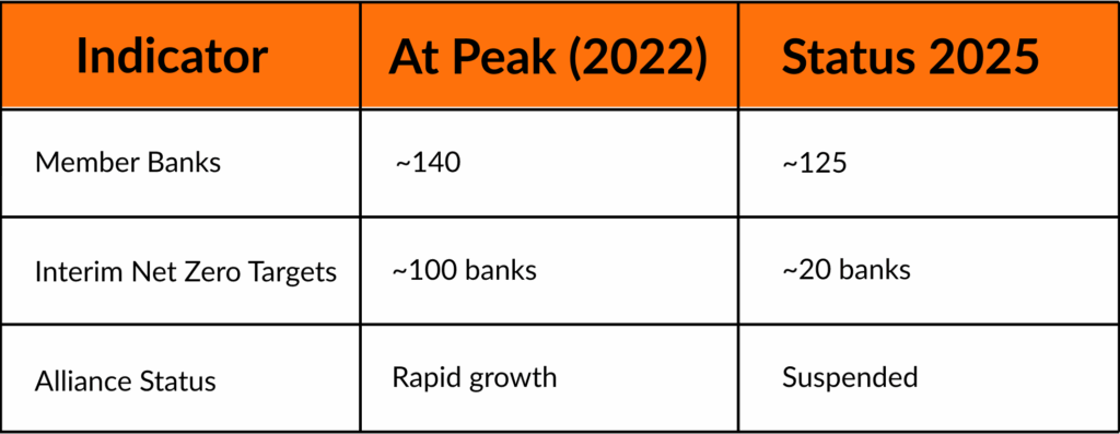 The UN banking alliance NZBA was finally suspended as big members exited (late-2024/2025) and as withdrawals by US industry leaders and later HSBC, UBS, Barclays and others, hammering the proverbial nail into the coffin.