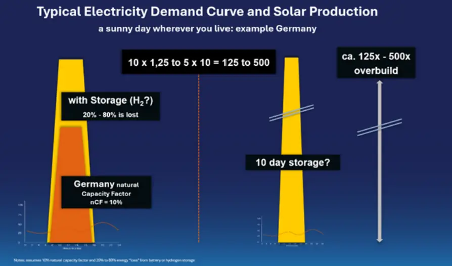 To understand the required overbuilding that may reach 125-500x for a 1:1 replacement of a gas or coal-fired power stations please watch this short video .
