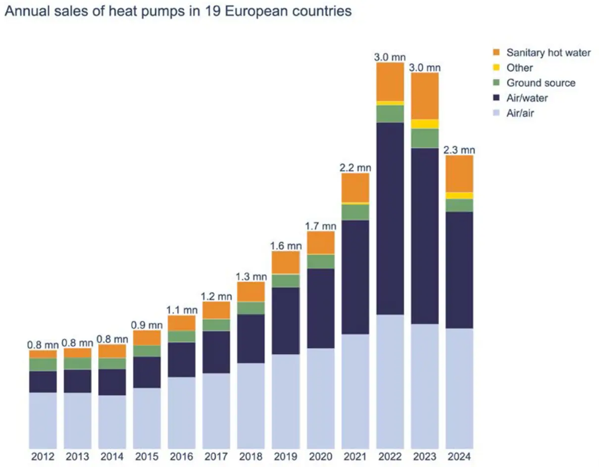 Heat pump sales are largely, though not exclusively, driven by subsidies. For example, according to the European Heat Pump Association, heat pump sales in Europe dropped over 20% in 2024 after reduced subsidy and policy support as well as policy uncertainty in various countries. (9), see Figure 6.