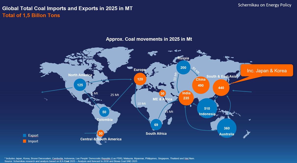 Finally, the import side of the ledger: in 2025, China again leads seaborne imports at roughly 550 Mt, followed by India with about 240 Mt. The ASEAN countries of Southeast Asia together import around 180 Mt, Japan 140 Mt, South Korea 100 Mt. [5] The EU imports roughly 120 Mt. Please remember that on average about 70% of seaborne trade is thermal coal for power plant use.
