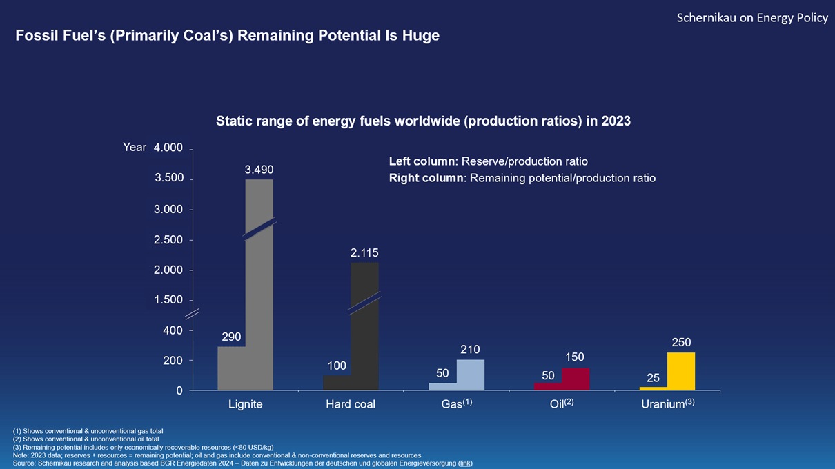 By that measure, coal is in a league of its own (see Figure 4). According to the German Federal Institute for Geosciences and Natural Resources (BGR) 2024 [6], the world holds over 2,000 years of hard coal and more than 3,000 years of lignite potential when considering known total remaining resources. Even if you only count proven reserves (economical to mine today), coal still shows about 130–150 years of supply which is far more than any other fuel.