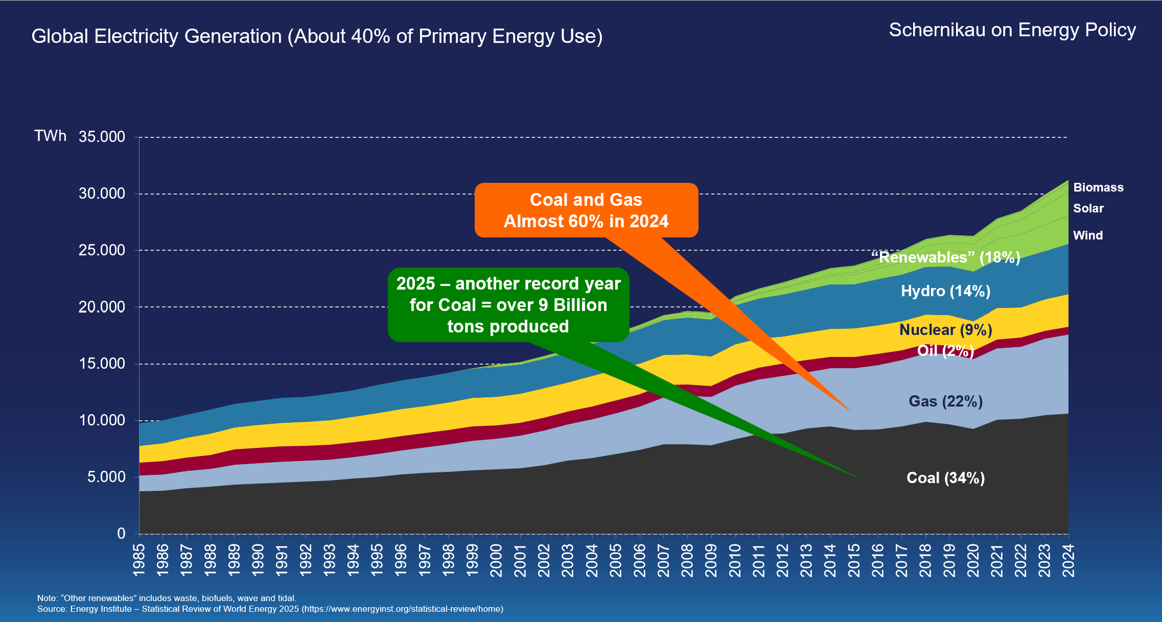 Figure 1: Electricity production by source | Source: Source: Energy Institute – Statistical Review of World Energy 2025